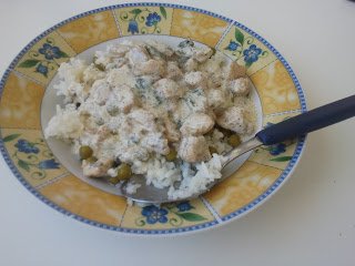 A rizsfőzéshez felteszem forrni a vizet, sót rakok bele. Van egy trükköm, amit kifejezetten rizibizinél szoktam alkalmazni. A borsó alatti levet soha nem öntöm ki, hanem a főzőlébe teszem. Így már főzés közben átveszi a borsó ízét a rizs. Míg forr a víz, addig a csirkemellet apró csíkokra vágom, sózom, borsozom és egy másik edényben a felmelegített olajra teszem. Kb. 10 percig fedő alatt párolom, majd a fedőt levéve tovább pirítom, míg a leve el nem fő. Közben persze a rizses zacskót belehelyezem a forró vízbe, aminek kb. 10-12 perc főzési idő kell. Miután leöntöttem róla a vizet, belekeverem a borsót, lefedem és hagyom hogy egy kicsit összeérjenek az ízek. Addigra már a csirkehusi is megpirul. Ekkor kerül rá az apróra vágott petrezselyemzöld és a doboz tejföl. Hagyom, hogy ezek együtt összerottyanjanak.