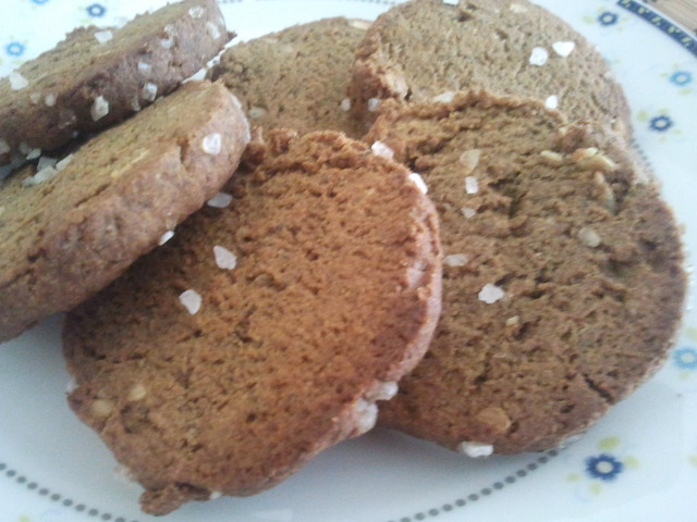 Az összes hozzávalót egy nagy tálba mértem, majd kézzel alaposan összedolgoztam. Lisztezett deszkán újra átgyúrtam, majd kb. 25 cm hosszú hengerré formáztam. A deszkára durva szemű tengeri sót szórtam, majd a hengert beleforgattam.. Folpackba csomagoltam, majd a hűtőbe raktam egy kicsit megszilárdulni (kb. 1 órát töltött bent). A sütőt előmelegítettem 160 fokra. Míg melegedett, elővettem a hengert és recés késsel kb. fél centi vastagra vágtam. Egy sütőpapírral bélelt tepsibe fektettem a korongokat, majd megszórtam újra durva szemű sóval. Kb. 15 perc alatt készre sütöttem, egy lemezen hagytam kihűlni.