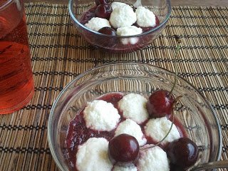 Egy üvegtálka aljára egy adag cseresznyeszósz került, majd erre a gombóckák. Cseresznyeszemekkel díszítettem.